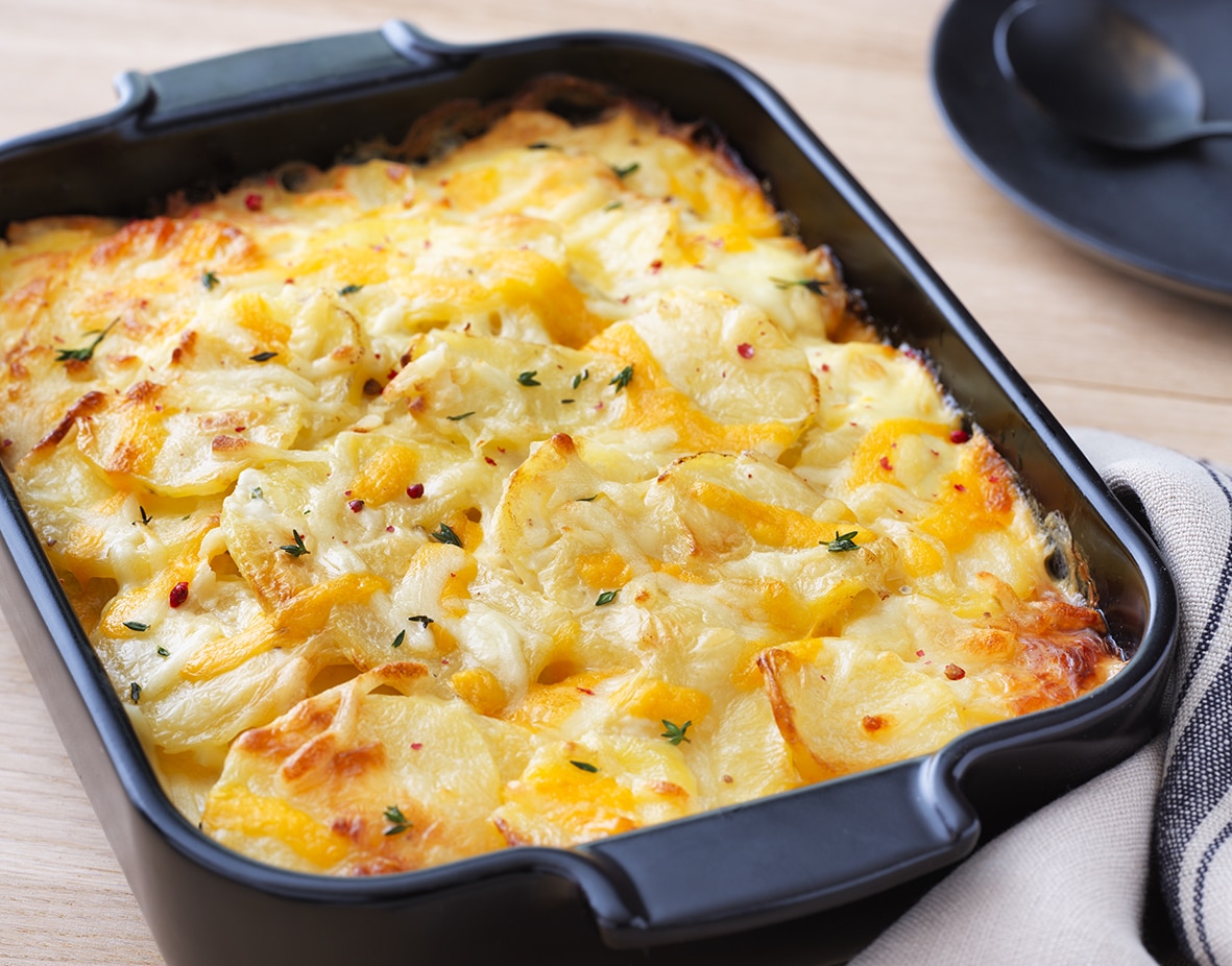 Colocar las rodajas de patata en la fuente, cubrirlas con la mezcla de nata y leche y la mezcla de mozzarella y queso Cheddar-Maasdam.